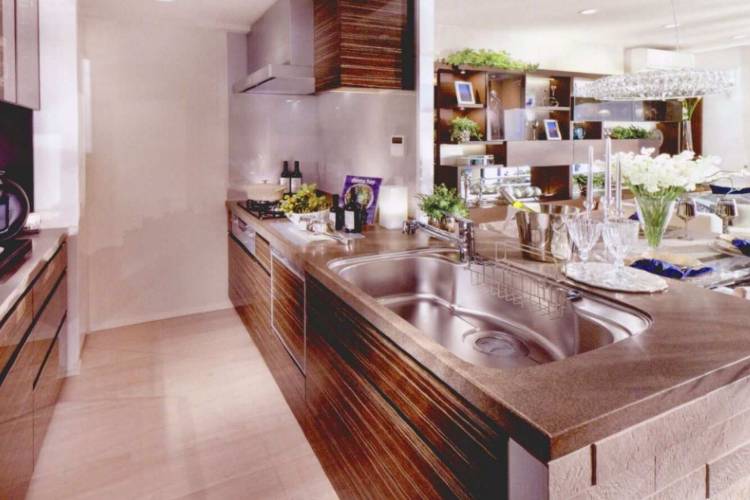 キッチンはフラットな対面カウンターが採用されています。段差がなく最大約900mmのワイドな奥行きがあるため、配膳する前のお料理の仮置きも持ち上げることなくスムーズにでき、対面側から一緒にお料理を楽しむこともできます。